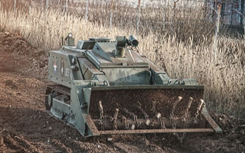 Робототехнический комплекс разминирования «Уран-6» уже успел пройти приемо-сдаточные испытания в Чечне – в Сунженском районе, а также принял участие в разминировании Пальмиры.