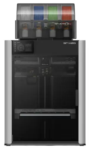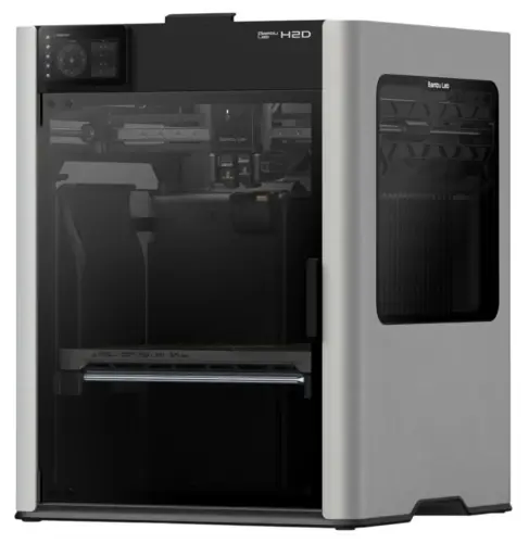 Bambu Lab H2D Combo — 3D-принтер с двумя экструдерами, обеспечивающий возможность печати несколькими материалами. Рабочий объем составляет 350х320х325 мм. Принтер оснащен системой оптической калибровки с разрешением 5 мкм. В конструкции используется сервоэкструдер с замкнутым контуром управления. Температурный режим сопла достигает 350°C, а камера активно нагревается до 65°C.